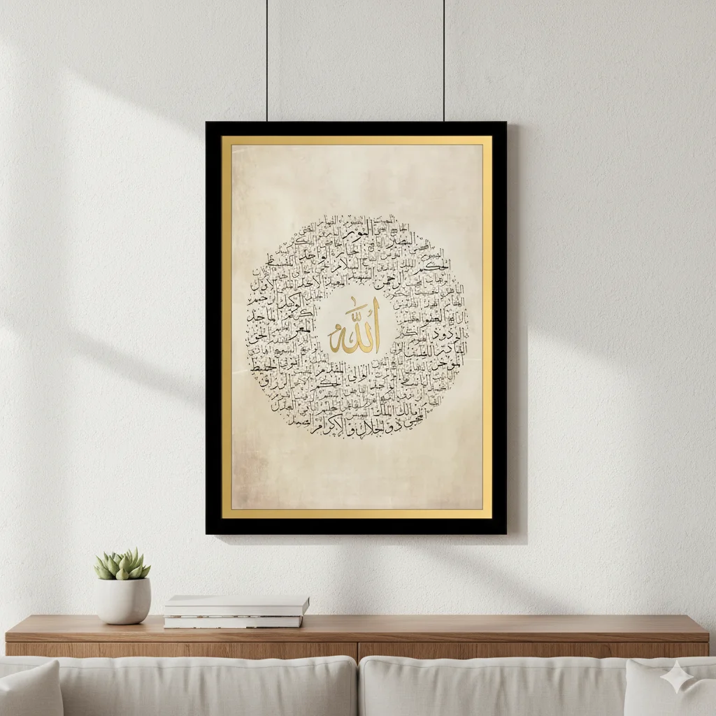 لوحة جدارية إسلامية راقية: فن الخط العربي لأسماء الله الحسنى وسورة ياسين (ديكور منزلي فاخر)